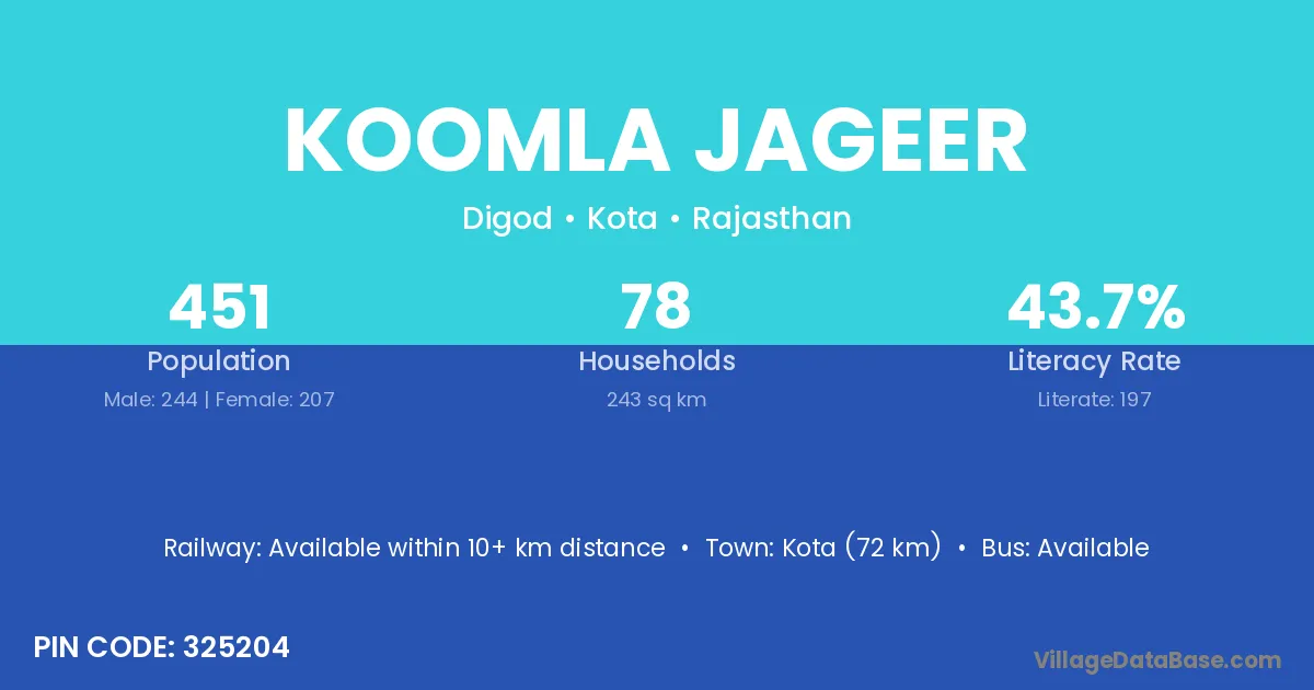 Kota (72 km) is the nearest town to Koomla Jageer village for major economic activities and is located approximately 72 km away.