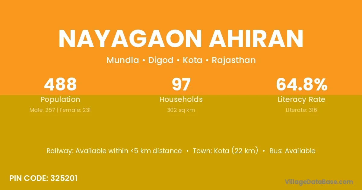 Kota (22 km) is the nearest town to Nayagaon Ahiran village for major economic activities and is located approximately 22 km away.