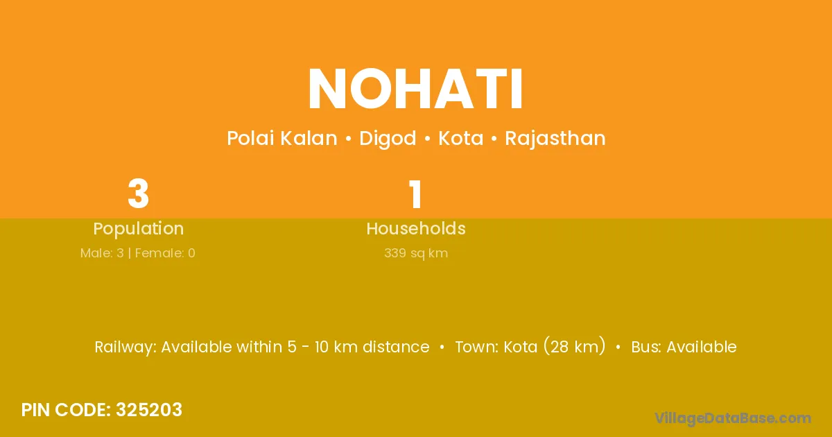 Kota (28 km) is the nearest town to Nohati village for major economic activities and is located approximately 28 km away.