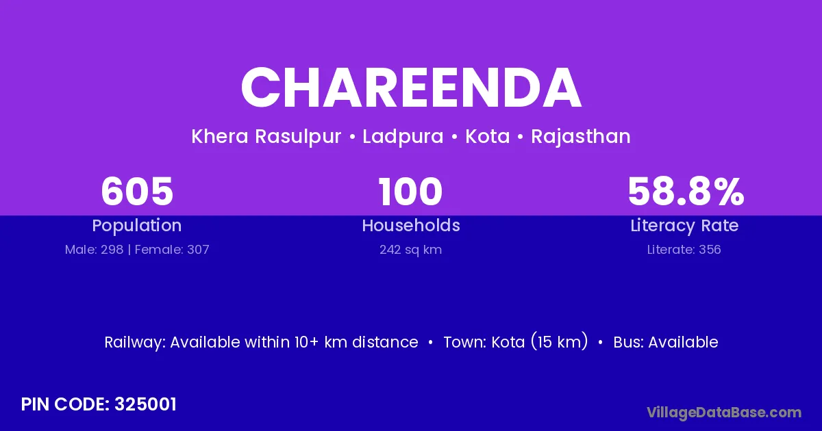 Kota (15 km) is the nearest town to Chareenda village for major economic activities and is located approximately 15 km away.