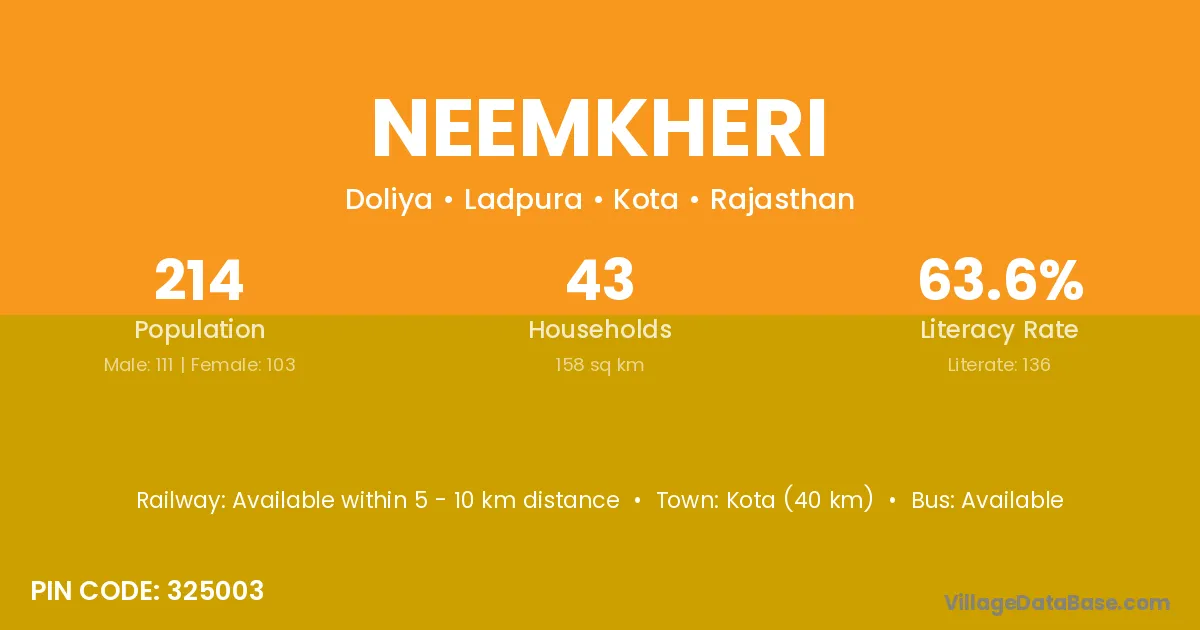Kota (40 km) is the nearest town to Neemkheri village for major economic activities and is located approximately 40 km away.