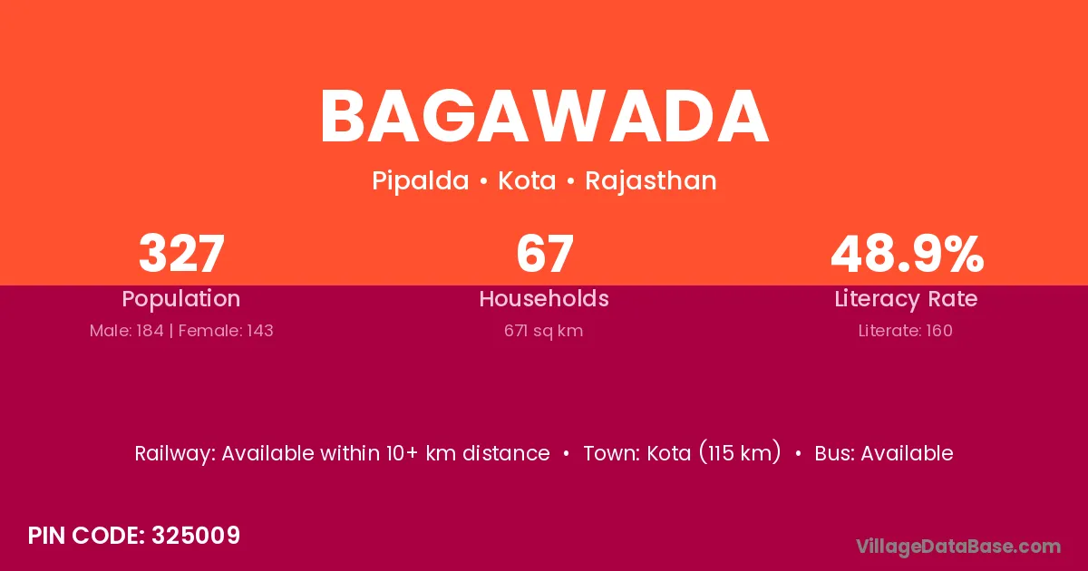 Kota (115 km) is the nearest town to Bagawada village for major economic activities and is located approximately 115 km away.