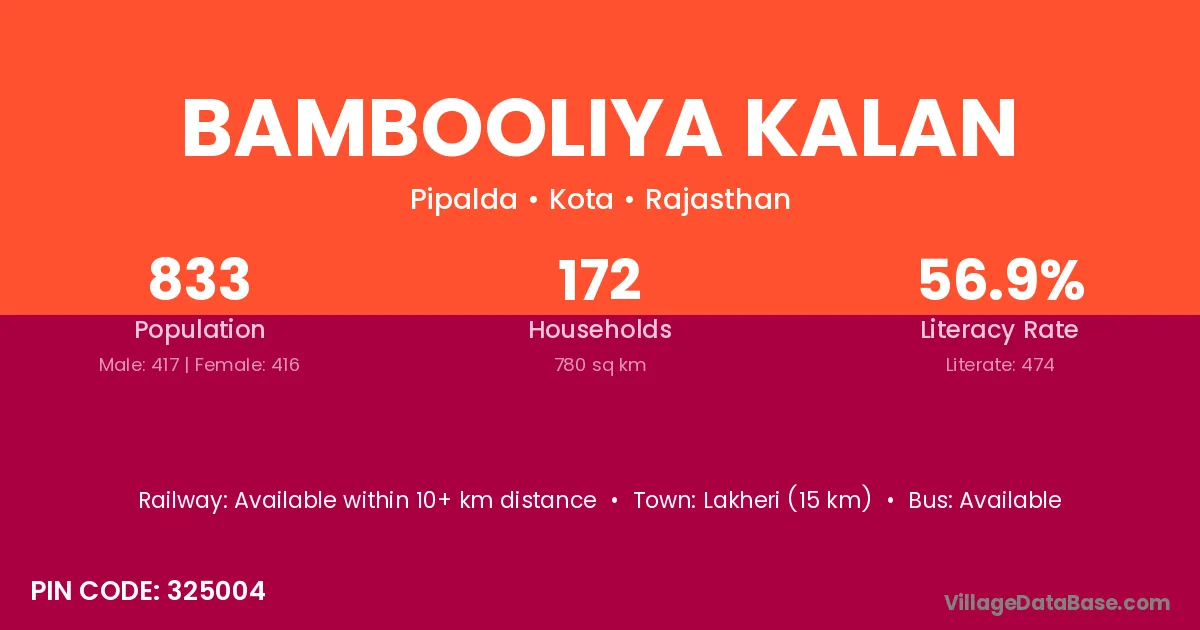Bambooliya Kalan village has a total population of 833 people, of which 417 are males and 416 are females.