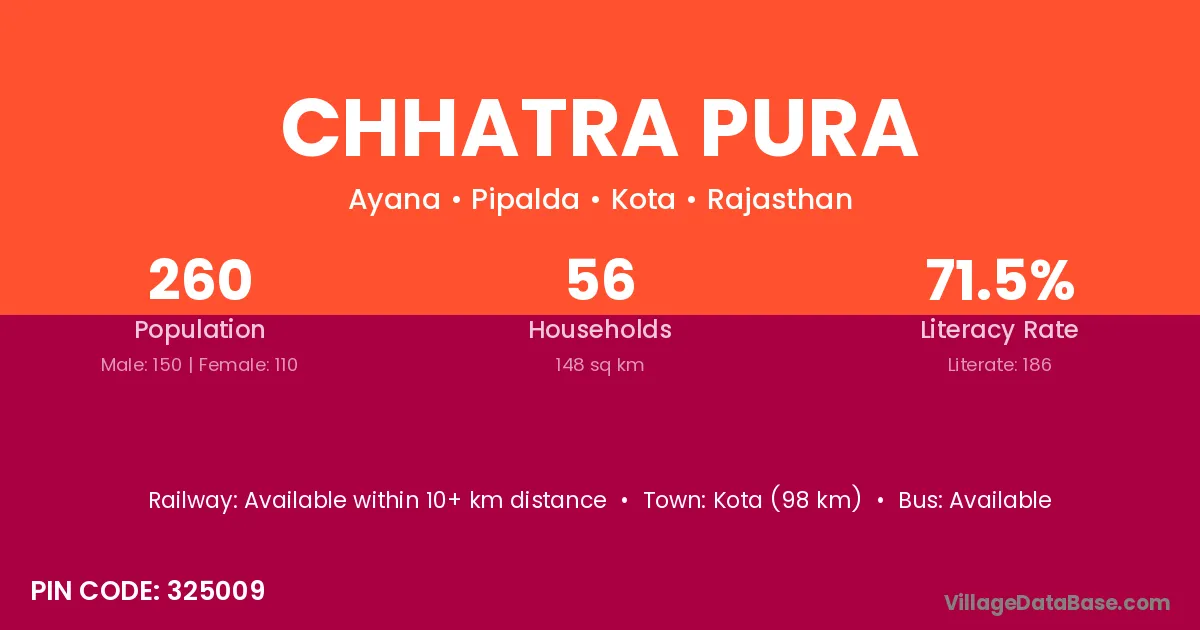 Kota (98 km) is the nearest town to Chhatra Pura village for major economic activities and is located approximately 98 km away.