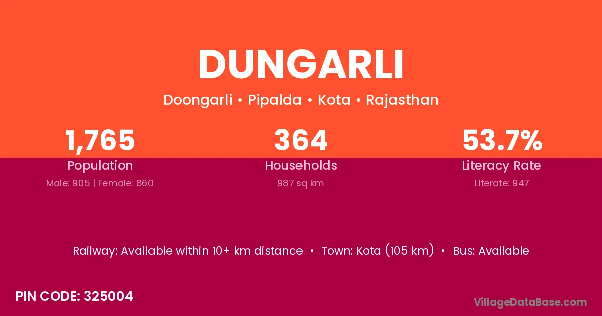 Kota (105 km) is the nearest town to Dungarli village for major economic activities and is located approximately 105 km away.