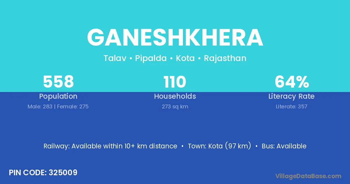Kota (97 km) is the nearest town to Ganeshkhera village for major economic activities and is located approximately 97 km away.