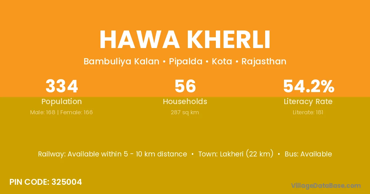 Lakheri (22 km) is the nearest town to Hawa Kherli village for major economic activities and is located approximately 22 km away.