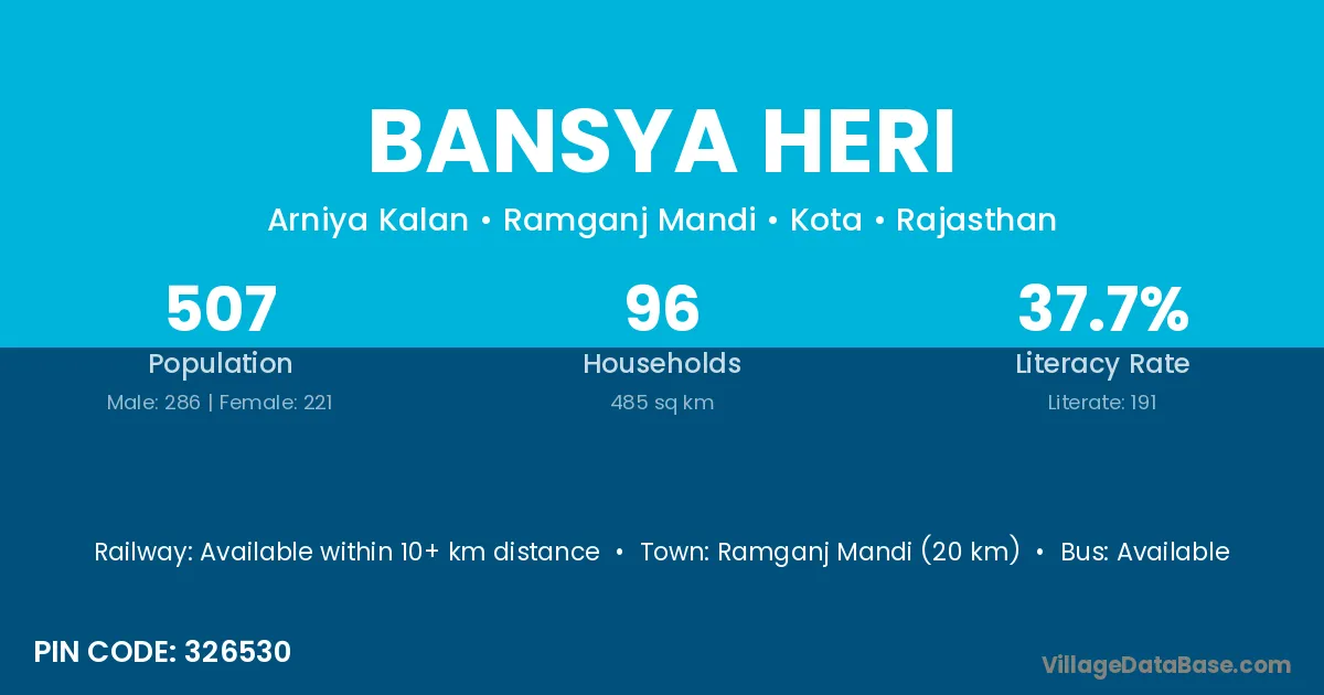 Ramganj Mandi (20 km) is the nearest town to Bansya Heri village for major economic activities and is located approximately 20 km away.