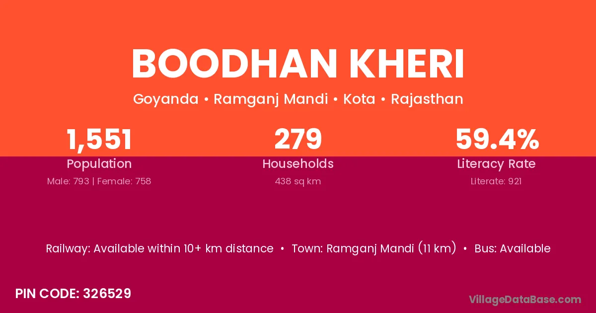 Ramganj Mandi (11 km) is the nearest town to Boodhan Kheri village for major economic activities and is located approximately 11 km away.