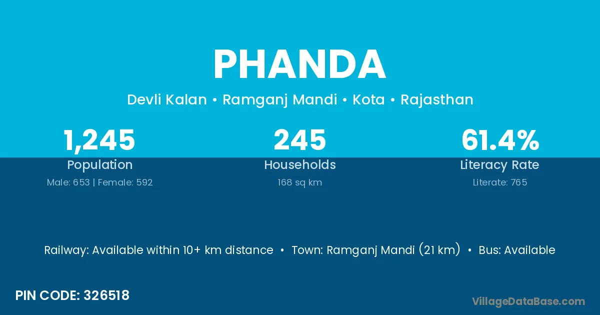 Ramganj Mandi (21 km) is the nearest town to Phanda village for major economic activities and is located approximately 21 km away.