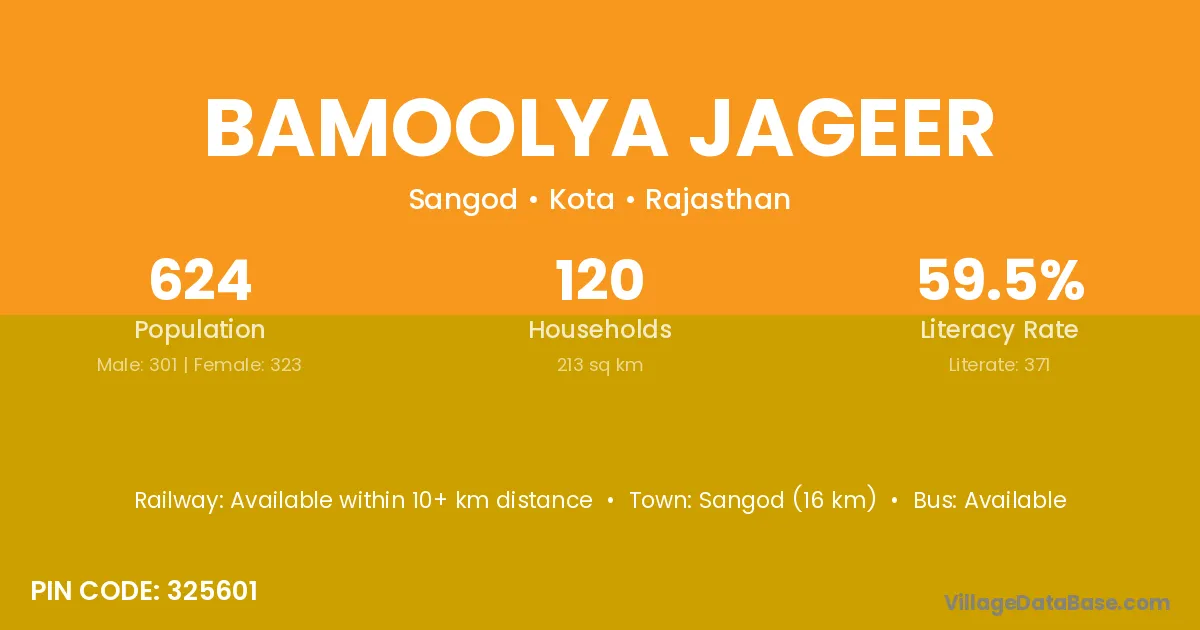 Bamoolya Jageer village has a total population of 624 people, of which 301 are males and 323 are females.