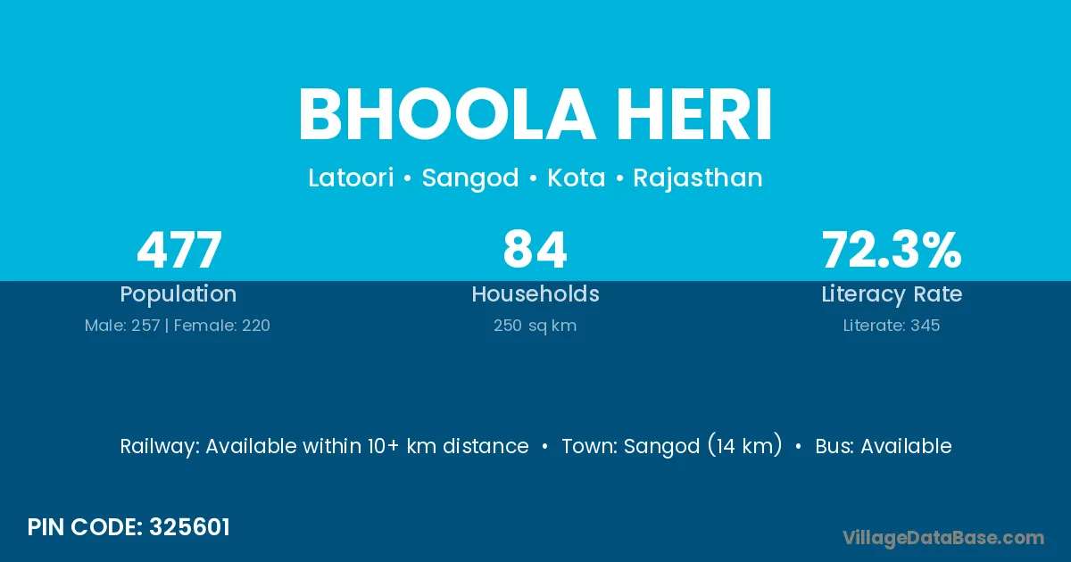 Sangod (14 km) is the nearest town to Bhoola Heri village for major economic activities and is located approximately 14 km away.