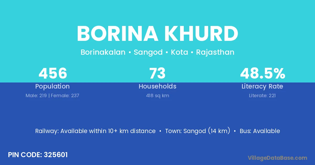 Borina Khurd village has a total population of 456 people, of which 219 are males and 237 are females.