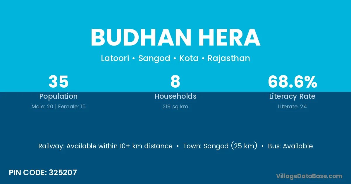 Sangod (25 km) is the nearest town to Budhan Hera village for major economic activities and is located approximately 25 km away.