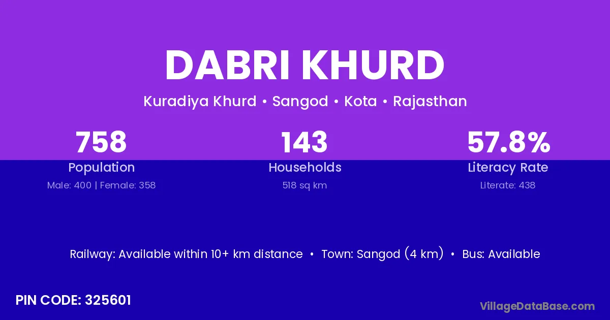Sangod (4 km) is the nearest town to Dabri Khurd village for major economic activities and is located approximately 4 km away.