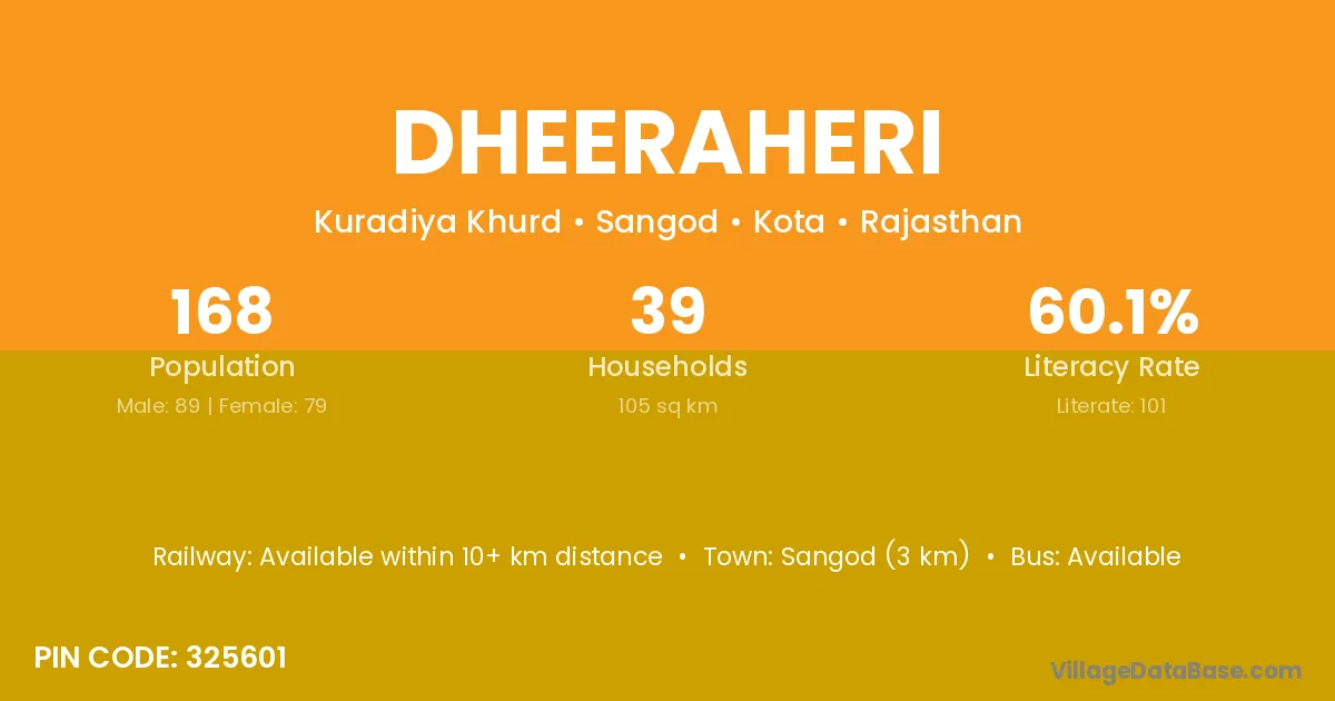 Sangod (3 km) is the nearest town to Dheeraheri village for major economic activities and is located approximately 3 km away.