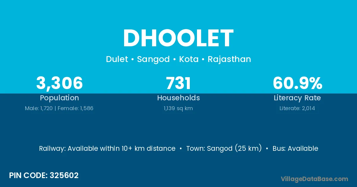 Sangod (25 km) is the nearest town to Dhoolet village for major economic activities and is located approximately 25 km away.