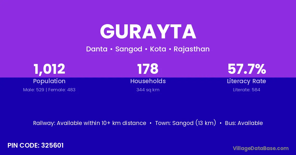 Sangod (13 km) is the nearest town to Gurayta village for major economic activities and is located approximately 13 km away.