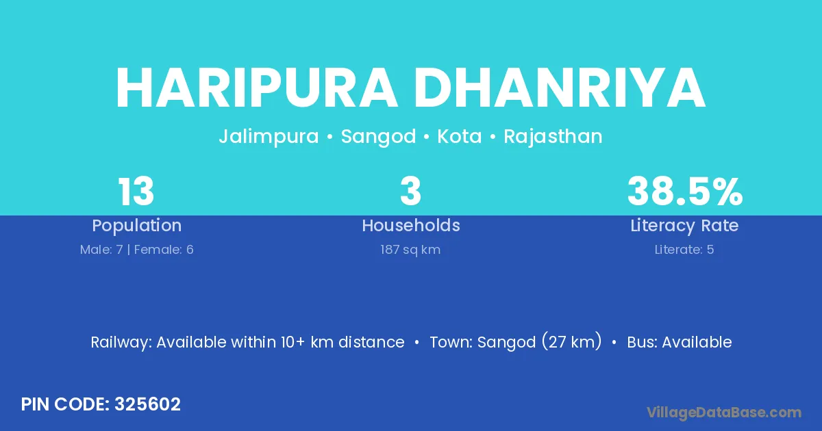 Sangod (27 km) is the nearest town to Haripura Dhanriya village for major economic activities and is located approximately 27 km away.