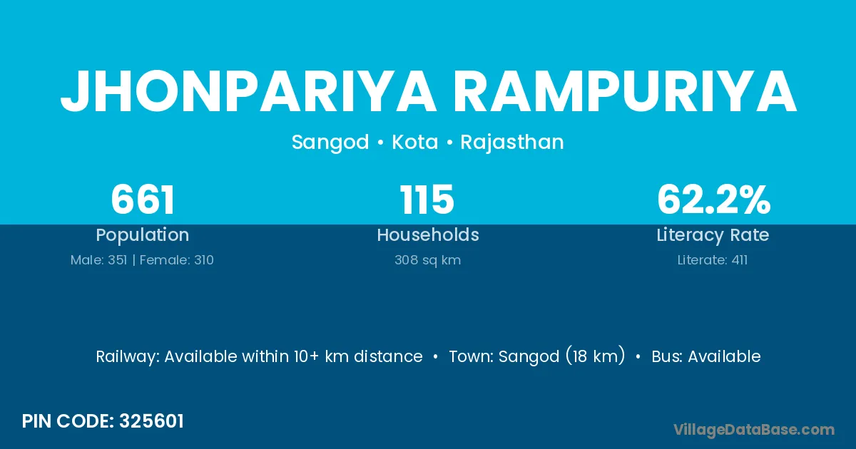 Sangod (18 km) is the nearest town to Jhonpariya Rampuriya village for major economic activities and is located approximately 18 km away.