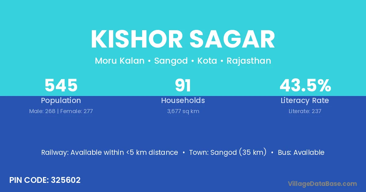 Sangod (35 km) is the nearest town to Kishor Sagar village for major economic activities and is located approximately 35 km away.