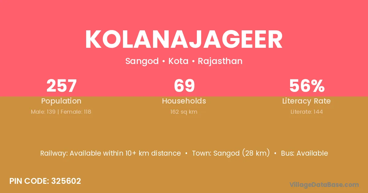 Sangod (28 km) is the nearest town to Kolanajageer village for major economic activities and is located approximately 28 km away.