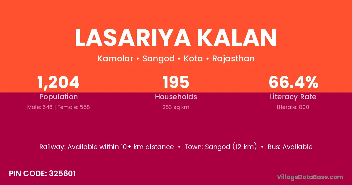 Lasariya Kalan village has a total population of 1,204 people, of which 646 are males and 558 are females.