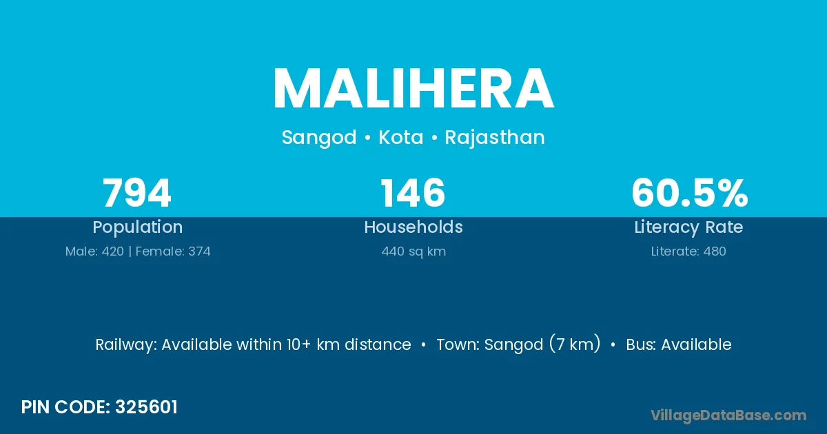 Sangod (7 km) is the nearest town to Malihera village for major economic activities and is located approximately 7 km away.