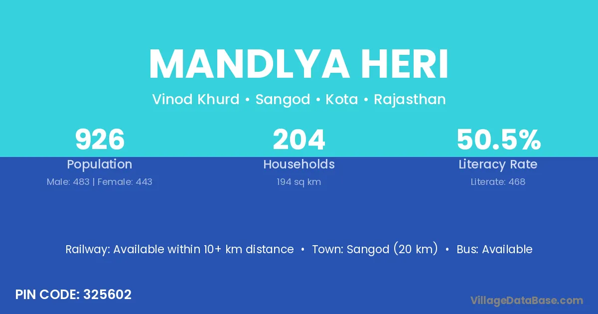 Sangod (20 km) is the nearest town to Mandlya Heri village for major economic activities and is located approximately 20 km away.