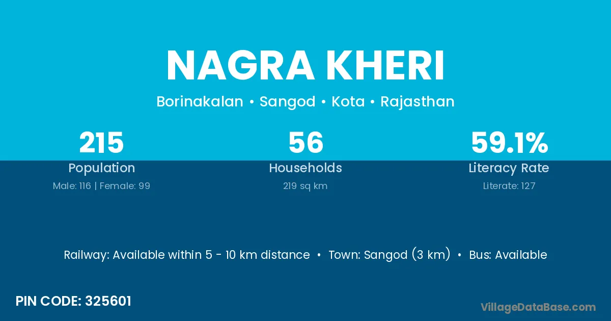 Sangod (3 km) is the nearest town to Nagra Kheri village for major economic activities and is located approximately 3 km away.