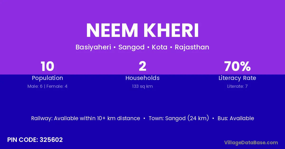 Sangod (24 km) is the nearest town to Neem Kheri village for major economic activities and is located approximately 24 km away.