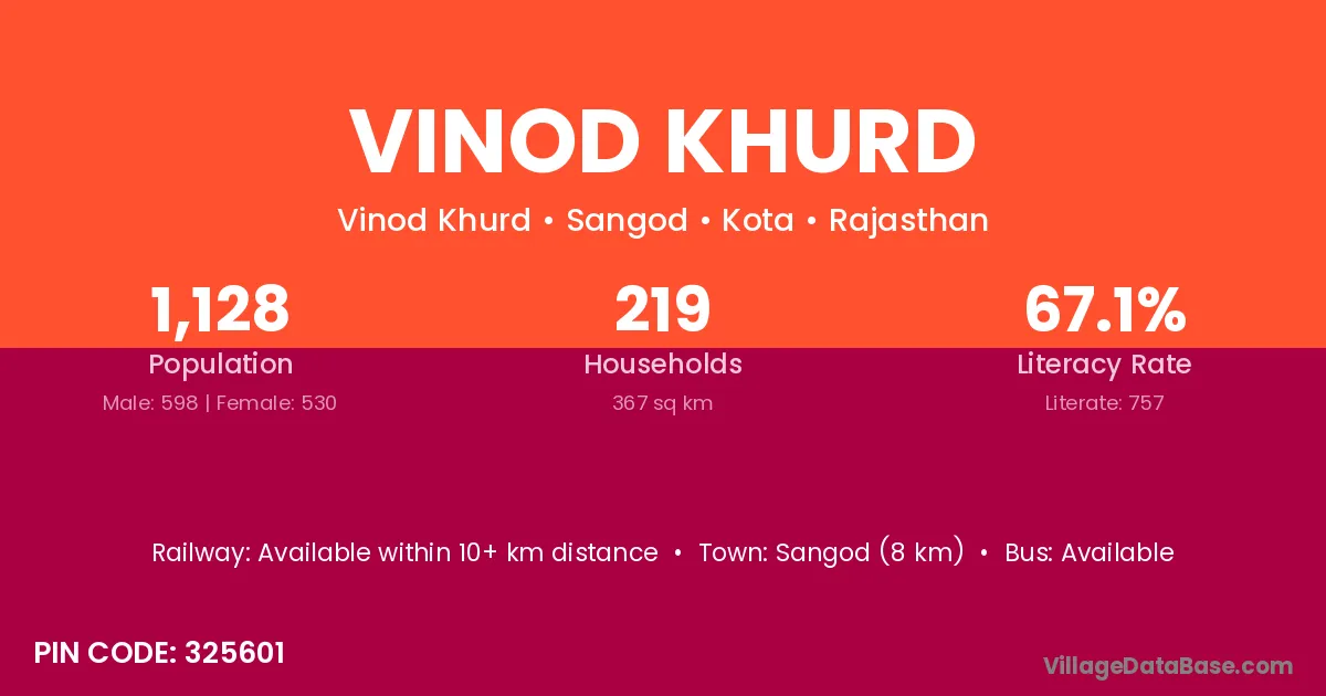 Sangod (8 km) is the nearest town to Vinod Khurd village for major economic activities and is located approximately 8 km away.