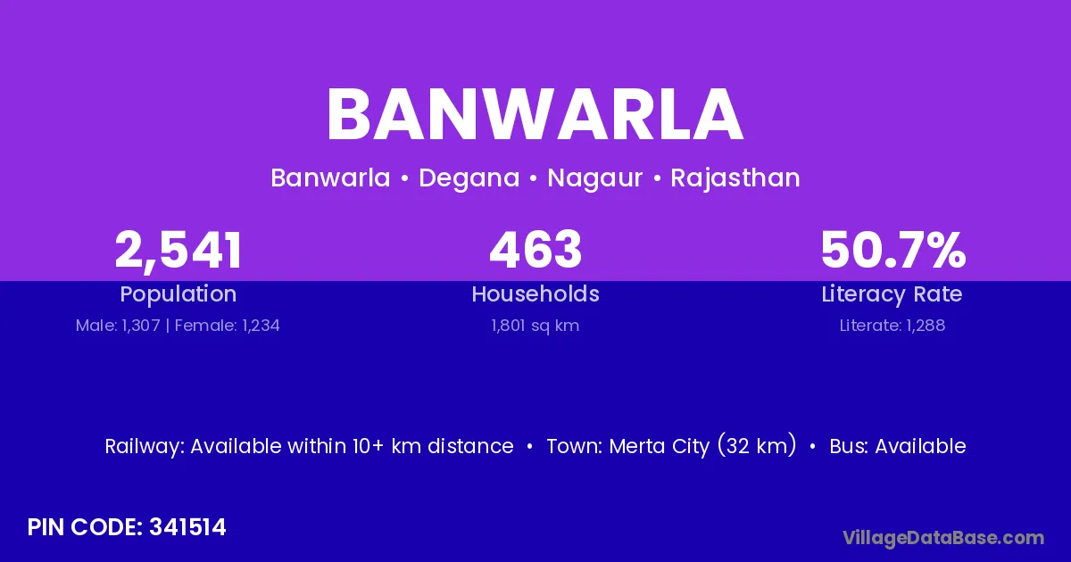 Merta City (32 km) is the nearest town to Banwarla village for major economic activities and is located approximately 32 km away.