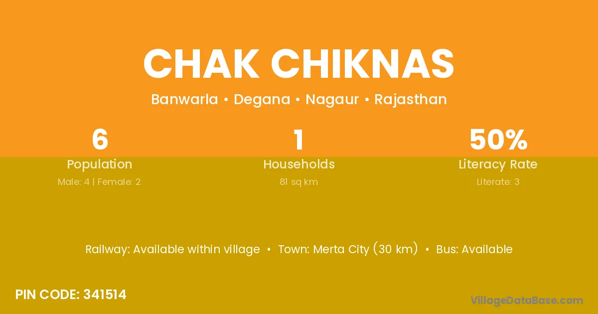 Merta City (30 km) is the nearest town to Chak Chiknas village for major economic activities and is located approximately 30 km away.