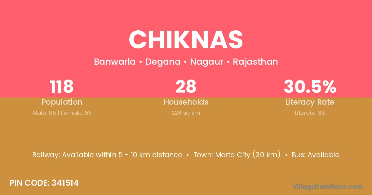 Merta City (30 km) is the nearest town to Chiknas village for major economic activities and is located approximately 30 km away.
