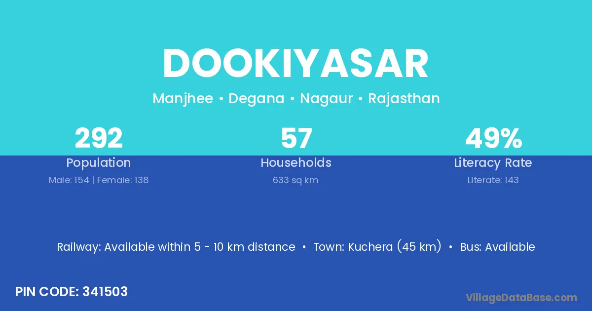 Dookiyasar village has a total population of 292 people, of which 154 are males and 138 are females.