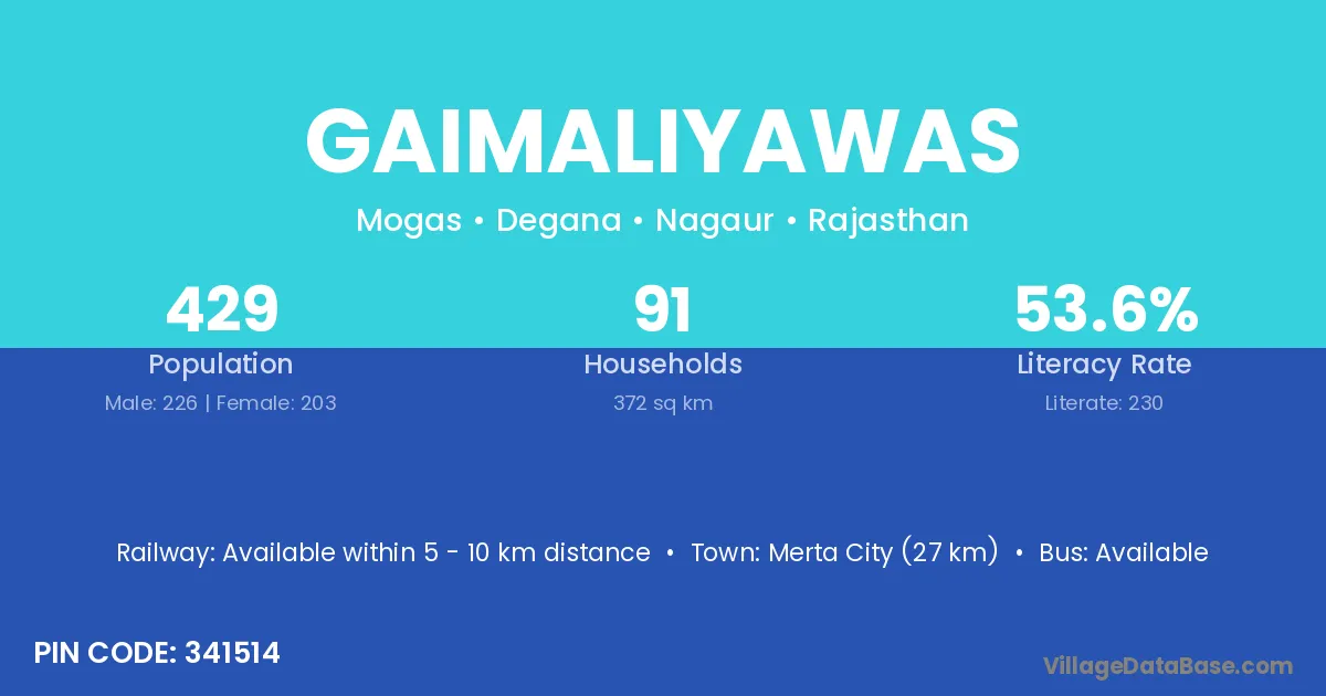 Merta City (27 km) is the nearest town to Gaimaliyawas village for major economic activities and is located approximately 27 km away.
