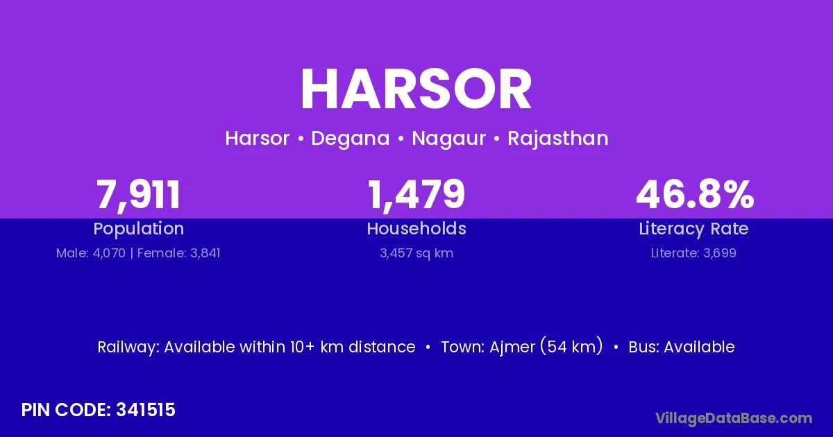 Ajmer (54 km) is the nearest town to Harsor village for major economic activities and is located approximately 54 km away.