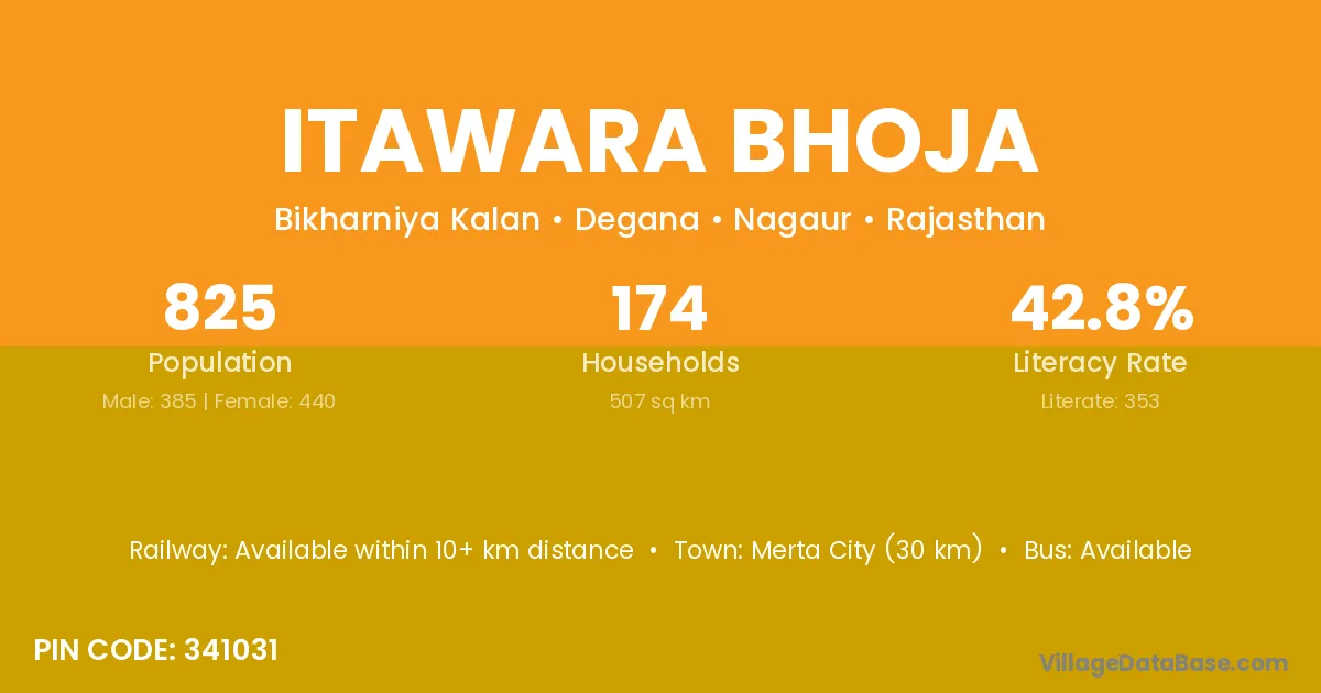Merta City (30 km) is the nearest town to Itawara Bhoja village for major economic activities and is located approximately 30 km away.