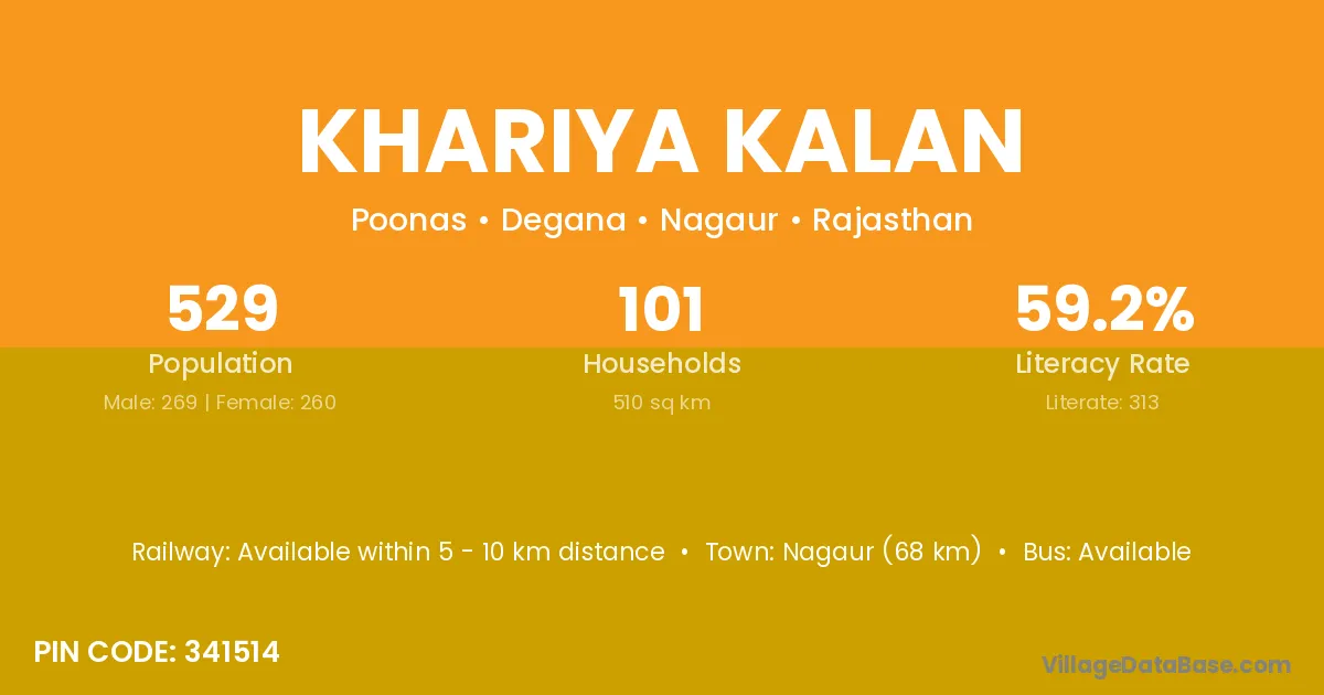 Nagaur (68 km) is the nearest town to Khariya Kalan village for major economic activities and is located approximately 68 km away.