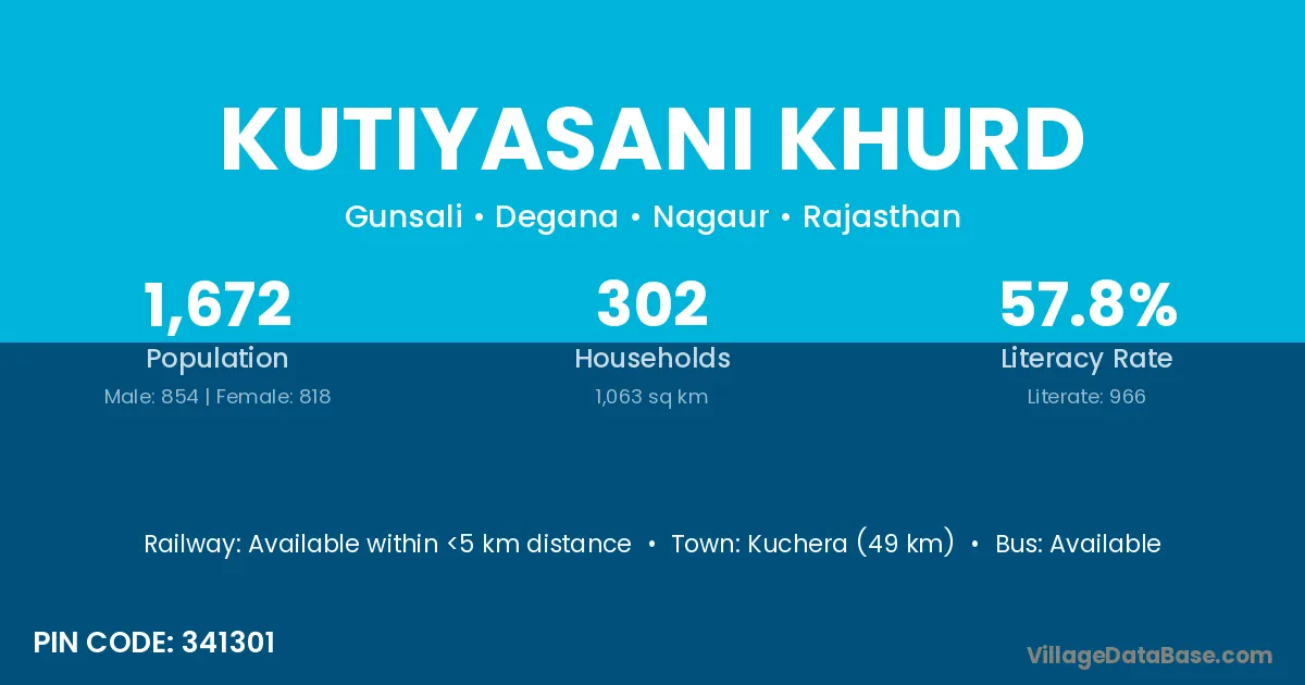 Kuchera (49 km) is the nearest town to Kutiyasani Khurd village for major economic activities and is located approximately 49 km away.