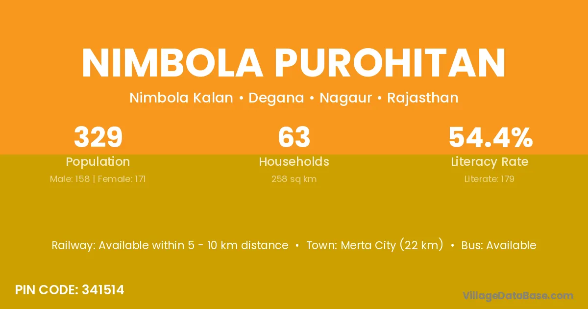 Merta City (22 km) is the nearest town to Nimbola Purohitan village for major economic activities and is located approximately 22 km away.