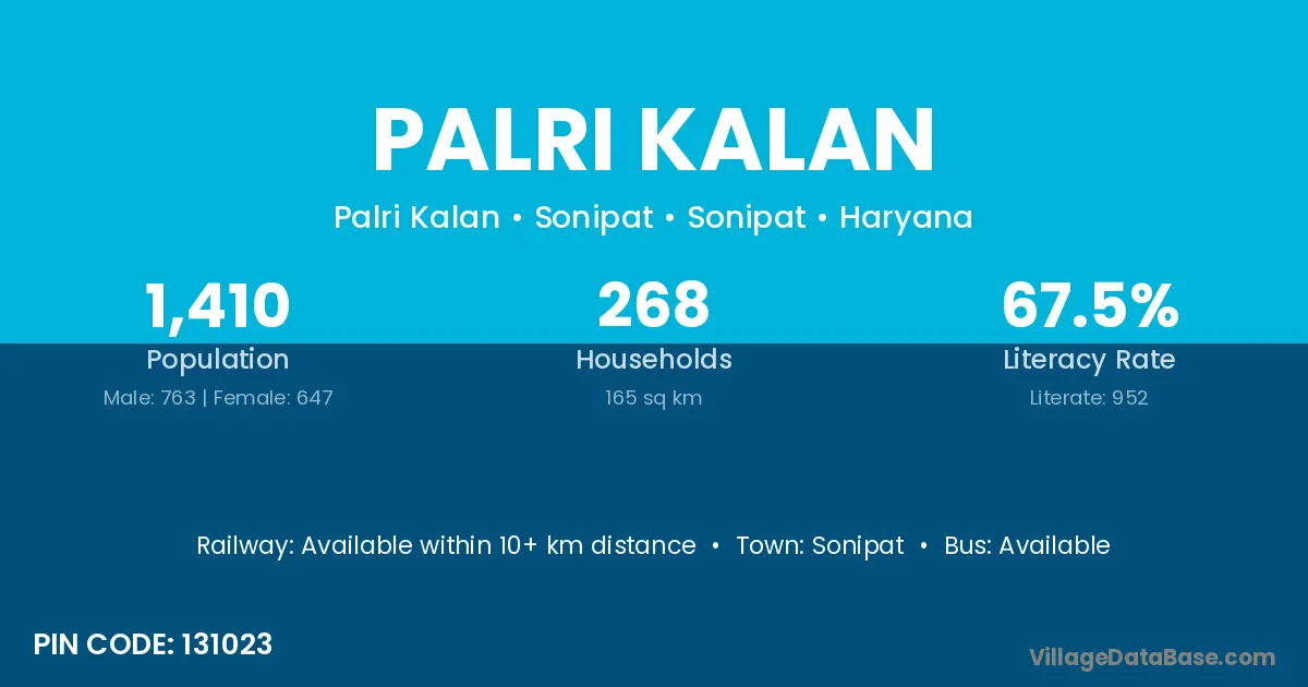 Palri Kalan village has a total population of 3,439 people, of which 1,738 are males and 1,701 are females.