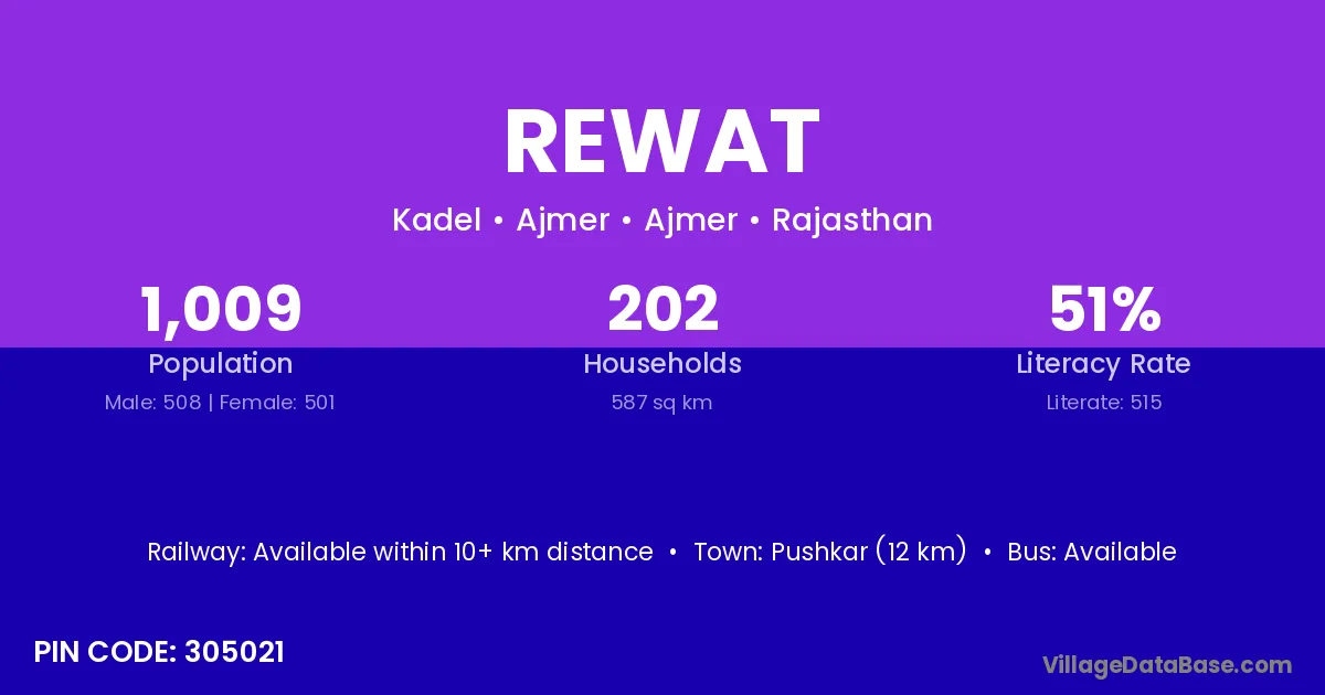 Rewat village has a total population of 1,853 people, of which 943 are males and 910 are females.