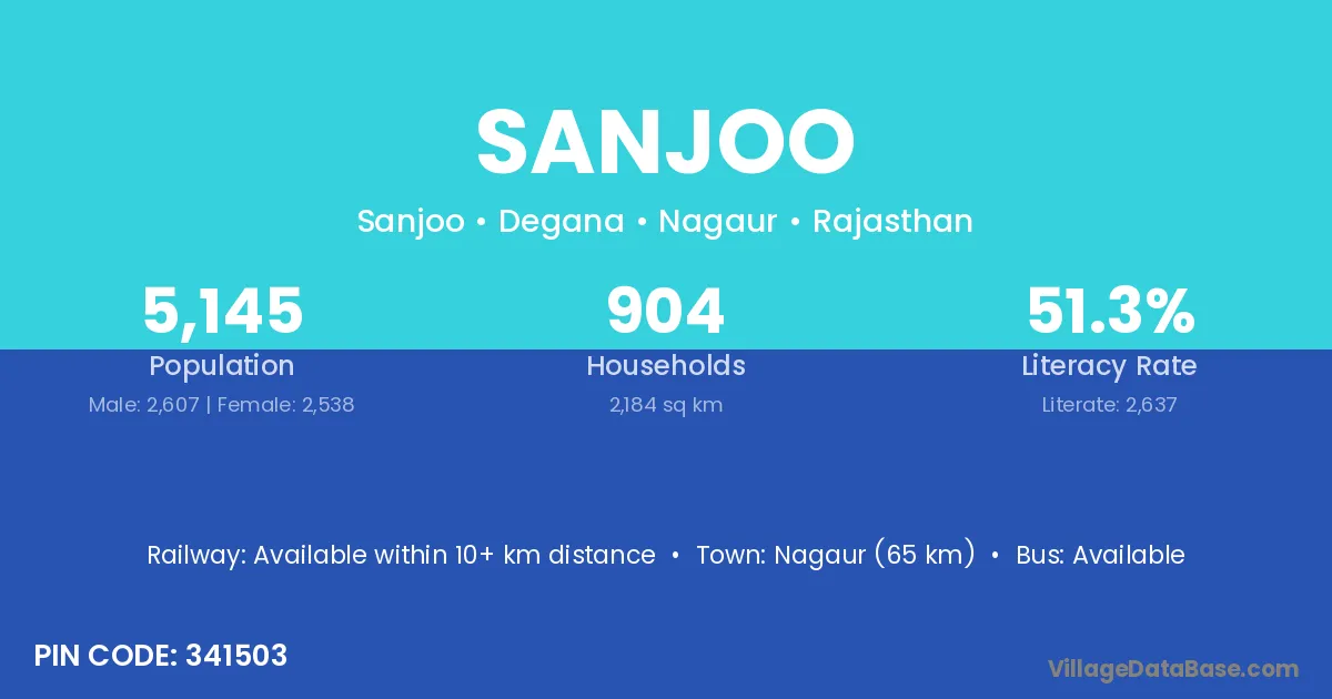 Nagaur (65 km) is the nearest town to Sanjoo village for major economic activities and is located approximately 65 km away.