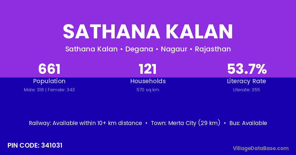 Merta City (29 km) is the nearest town to Sathana Kalan village for major economic activities and is located approximately 29 km away.