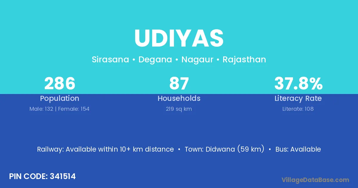 Didwana (59 km) is the nearest town to Udiyas village for major economic activities and is located approximately 59 km away.