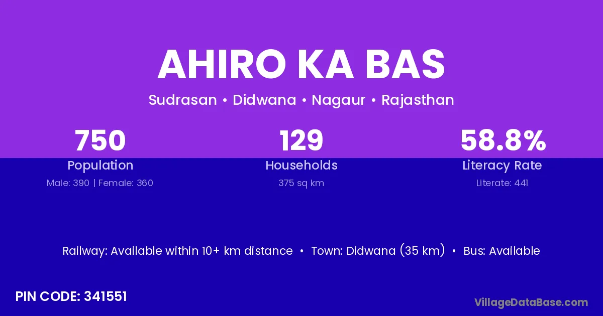 Didwana (35 km) is the nearest town to Ahiro Ka Bas village for major economic activities and is located approximately 35 km away.