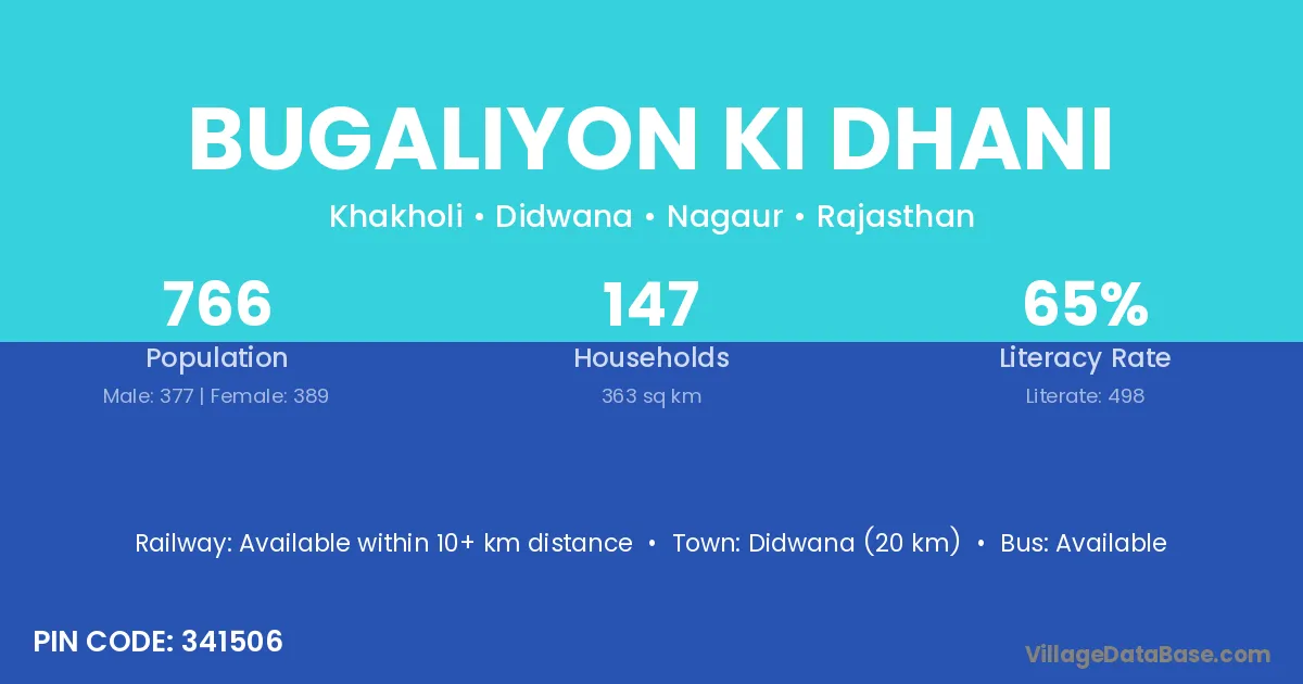 Didwana (20 km) is the nearest town to Bugaliyon Ki Dhani village for major economic activities and is located approximately 20 km away.