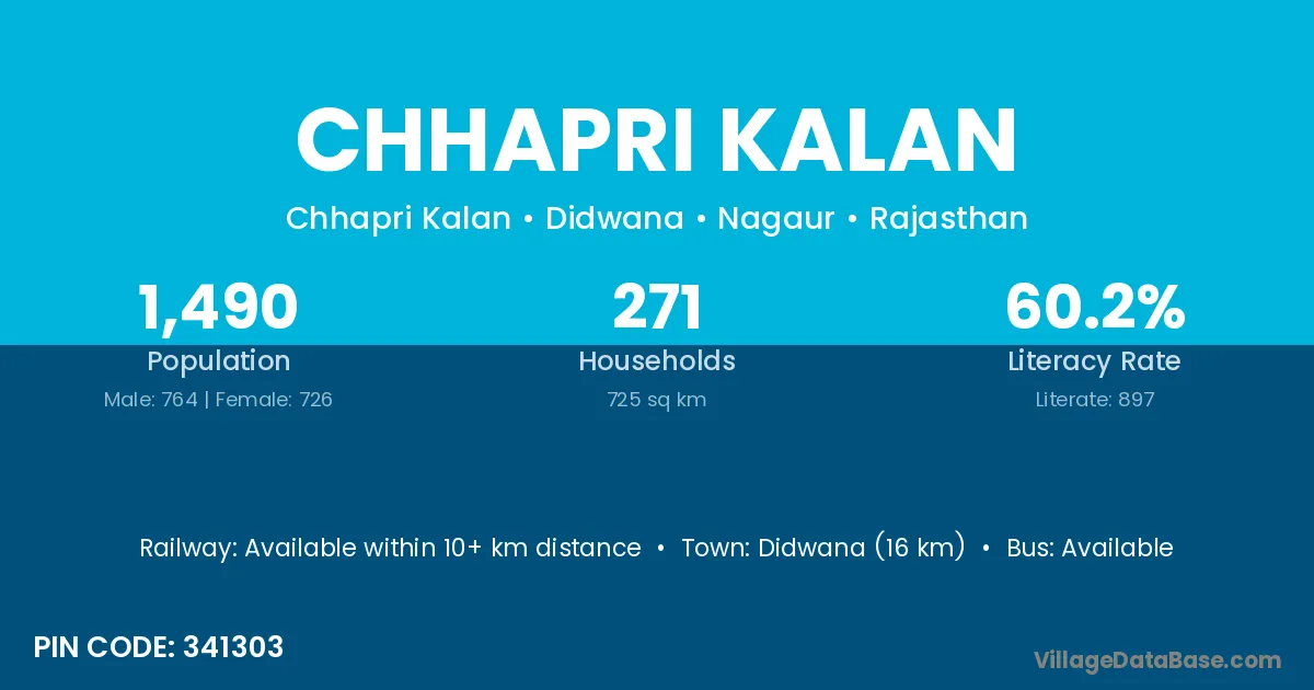 Didwana (16 km) is the nearest town to Chhapri Kalan village for major economic activities and is located approximately 16 km away.
